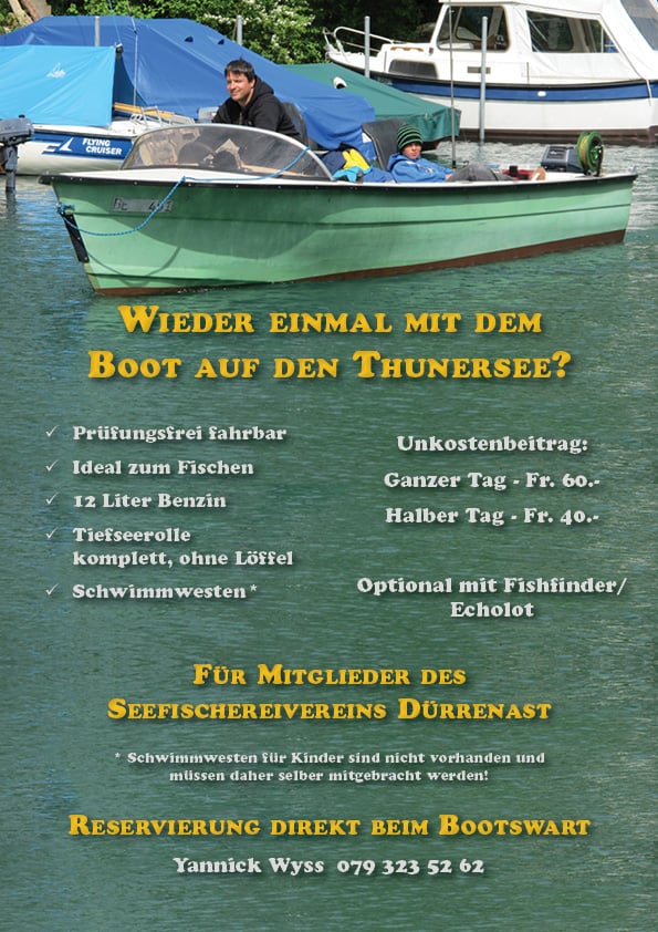 Gegen einen Unkostenbeitrag, wird das Vereinsboot ausschliesslich den SFVD Mitgliedern zur Verfügung gestellt.